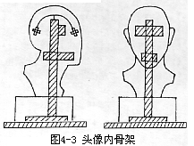 先要确定雕塑的正面及基座的正面,一般是与雕塑台边缘的一边相平行,头像架的下部有“十”字架形,也有“T”形,如果是“十”字架形,钉在木板中间部位即可。如果是“T”形架子,应把长的一边横向钉在木板的中心部位(如图4—2)。因为这样架子才会与板子更结实。反之则破坏了板子结构,导致板子松动,雕塑摆动或摇晃。