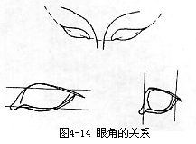 空间关系的进一步正确,形体关系的进一步明确,形体面向转折的调整就更准确。 讲到转折就要讲高低点的关系。所谓“高点”是相对“低点”而言,是头像中凸出的点,头像相对低凹之处,也就是所谓的“低点”,而高点和低点往往不是单独存在的,它们会形成“高点区域”和“低点区域”,转折面与面之间的交点地带即是“高点区域”,高点区域给人膨胀、扩张、浑厚而有力量的感觉;“低点区域”是那些处于阴影部,形体中凹下去的地带,它给人收缩、虚无和神秘的感觉,而这两种关系又是相互对比、衬托,好比绘画的虚实关系。而往往这种“高点区域”和“低点区域”不是一成不变的,它们是相互转换,这种转换正是雕塑的“生命力”的体现。 五官细节刻画。这是最吸引人的地方,从这一步开始时,我们要求学生先做“加法”,不要求考虑效果,先看自己能理解多少,能表现多少,注意这里的“加法”不是指体量中的加法,而是指尽自己最大理解,去“说明”对象,要求对一些小的细节的解剖非常熟悉,并一定要仔细并多角度观察对象。这里我们着重讲讲眼睛的变化。 正面平视看一只眼睛的两个眼角的关系是内眼角低而外眼角高;侧面平行看,内眼角在前而外眼角在后,而且由于它附着在球体上,所以两眼睛的四个眼角的连线应成一个弧形。(如图4—14)