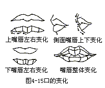 眼球的位置决定了上下眼睑的高点位置,所以有些雕塑家不做眼球,但却靠眼睑高点把眼球的视线表现得淋漓尽致,而左眼与右眼的对称感多数被视线打破,即一个眼睛的高点靠内眼角确定,另一只眼的高点则靠外眼角确定,且要注意左右眼睛的视线一致。另外上下眼睑这个面也存在厚薄和翻转的变化。 下面再谈谈嘴、身体和身的一些变化关系。嘴的变化,首先它是附着在一个柱体上的。所以口轮咂肌的所有连线也成弧形。另外它的面向变化也是复杂的,从侧面看,它有向上、向前、向下、向里的面向变化。同时它又有如图所示的从左到右的变化。而这两种关系重叠在一起后它的关系就变得更复杂了。(如图4—15)