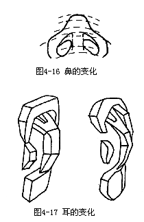 鼻体要注意鼻骨与鼻头的软硬结合。鼻翼与整个体积的关系。(如图4—16) 耳的小面变化关系。(如图4—17)
