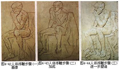 1.比例 1米左右高,最厚与底板高差为15cm。 2.材料准备 铁钉、棕绳、雕塑刀、薄膜、喷水壶等。 3.架子 架子与浮雕头像架子一样,只是尺寸更大些,同样缠上铁钉,以便挂泥。 4.制底板 同浮雕头像制底板一样,只是略厚些,因为这样可以更好地保持水分,从而减小泥的收缩性,较好地控制裂缝。 5.画像(如图4—42) 同浮雕头像的制作一样先设定一个光源,以便使板面成中间色调,并选定一个角度,初学者最好是半侧面或侧面,然后用线准确地描绘出对象,同时,注意对象的比例、动态和透视,以及画面的构图。 6.加泥(如图 4—43) 加泥既要仔细又要大胆,经过仔细观察,争取一次把体量加足,形状加到位,压紧拍实,再用雕塑刀稍稍归纳。等全部加了一层泥后,首先检查轮廓线,把多余的去掉,少的补上;再调整各形体间的边缘线,然后找出形体的大面转折,轻轻拍出大的面向。 这时许多画好的线都被遮盖,所以,还应在加好泥后的像上再画出形或做记号,同时调整形体的透视。 7.背景的表现 这个背景有两层含义,一是如头像上所讲应垂直加一定厚度的泥,以表明形体被遮住部分。二是模特儿背后的环境空间。它包括一些简单的道具,如人体中的椅子和衬布等等,而椅子和衬布的塑造也和人体一样,依照空间次序加以压缩,同时做好形的透视,以及面的转折。 8.进一步塑造(如图4—44) 首先是构图、比例、动态和透视的调整。画面构图形式、节奏安排、疏密的布局都应先有考略,并有意图的表现,再调整比例动态,做出头、胸、盆骨,三大体在相互影响及透视情况下的关系应包括相互间的比例尺寸和视觉量感的比例。然后归纳出大的空间层次,及近、中、远和背景。 如近景为:头、左手臂、左手肩头、左腿、右腿及盆骨、胸,远为右肩及右手臂,但近,中,远这三个大层次中又有变化,如近景中的左膝是最高的,其次是左前臂及左手和左小腿,最后是左肩、左上臂及左大腿和左脚掌,这样近景中又有前后层次变化,从而使雕像更细腻、更微妙。 解剖结构的塑造,从外走到里,要注重骨与骨的位置长短、对称,肉与肉的位置、起止、厚薄和肉与骨的关系,露骨的关节部位,方、硬、转折的明确,被肉覆盖的地方要圆、厚、体量饱满。 最后再归纳大的面向转折和基本形,从而保证大关系不被破坏。 9.深入塑造 这一步主要是对五官特征、形象气质和手、脚、关节的塑造。细部解剖结构要丰富、准确,紧张与松弛的对比、表面肌理、挤压和拉扯关系等要处理好。 膝关节的方、硬,胫骨的方、硬,髌骨的位置方向,膝关节中内在的股骨头、胚骨头、腓骨头的细小关系,膝关节的“方”与大腿的肌肉“圆”的对比(但同时肌肉也是“圆中带方”)等也是深入塑造过程中必须注意的。 腰的压缩、松弛与上臂的拉开受力。同时肘拉开而臂弯则挤压;手腕及上臂前段成“方”形,后段小臂伸缩肌群成“圆”形,左脚用力则右脚松弛等等,这些小的关系一步一步深入明确,从而使对象更充分,更细腻。 随着工作的深入,光靠大面显得简单也无法完全说明形态,因此根据内在结构,肌肉、骨骼的穿插覆盖可变化成许多的小面及过渡面使得塑像更丰富,更细致。 形体结构准确,动态准确,透视准确,近大远小,近处的体量充分,远处的体量弱。表面的肌理如皮肤的质感、布的质感,头发的质感,骨头的硬实感觉,肌肉的弹性感觉,背景的虚实感觉等等。光滑,粗糙,细腻,简单,规则的,不规则的,有意的,无意的等等。 人与布的关系,主次、强弱,布与背景的关系,骨与肉的关系,是否由于深入而削弱了大关系,方的变“软”变“圆”,而“圆”的变“硬”了,局部细节是否太跳,太过。 总之,这一步要认真思考,反复调整直至整个效果达到最佳。 |
