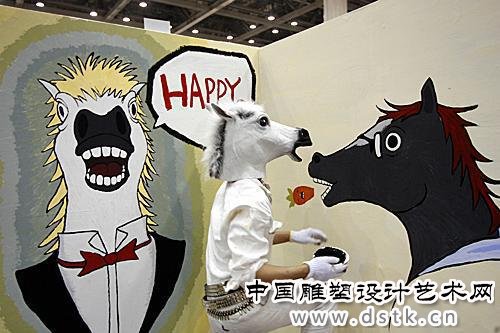 资料图:在日本东京举行的原创设计艺术节上,一位头戴面具的设计师在展台上绘制海报。(新华社)